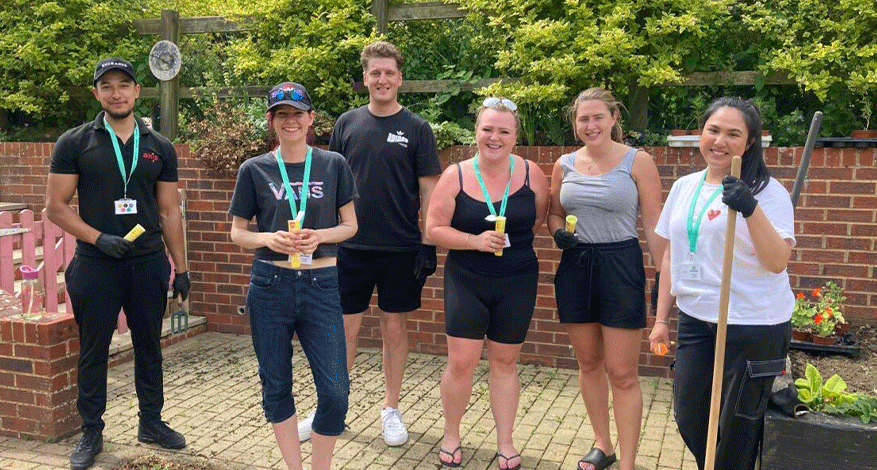 Axis volunteers conducted a garden makeover at Demelza’s hospice in Sittingbourne, Kent. They helped to tidy up the gardens by weeding and clearing paths, and set up Christmas trees, a gingerbread house archway and an inflatable Christmas dinosaur.